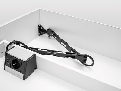 Schluss mit dem Kabelsalat in der Kücheninsel, der Werkstatt oder im Bad. EVOline®Wing ist die Lösung zur sicheren Kabelführung. Dadurch liegen die Kabel in den Schubladen nicht mehr einfach nur herum, sondern werden sicher durch eine platzsparende Führung hinter dem Schubfach gestützt. Somit gibt es keine beschädigten, geknickten oder eingeklemmten Kabel mehr, zudem sorgt die Lösung für ein reibungsloses Öffnen und Schließen der Schublade.