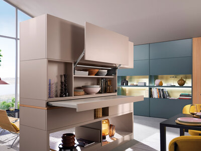 Aventos HF top revolutioniert das Design und die Funktionalität von Hochschränken. Dieser innovative Beschlag ermöglicht beeindruckende Hochfaltklappen mit zweiteiligen Fronten, die nicht nur optisch bestechen, sondern auch in der Benutzerfreundlichkeit. Ob schmale oder breite Aluminiumrahmen, die Kombination verschiedener Materialien oder asymmetrische Fronten – der HF top eröffnet neue Gestaltungsmöglichkeiten für hohe und mittlere Oberschränke. Mit dem integrierten Öffnungswinkelbegrenzer wird der Raum bis zur Decke optimal genutzt, ohne anzustoßen. Große Klappen bis zu 1.200 mm Höhe bieten eine clevere Versteckmöglichkeit für Küchengeräte und setzen mit asymmetrischen Fronten und Materialmix kreative Designakzente.