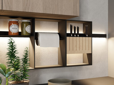 Das Basiselement – ein mattschwarzes Aluminiumprofil mit integriertem Licht – kann mit einer Vielzahl von Accessoires kombiniert werden: Ob in der Küche mit Gläser- und Küchenrollenhaltern oder im Badezimmer mit Seifenablage, Tablet-, Handtuch- oder WC-Papierrollenhalter oder simpel im Wohn- oder Bürobereich mit Regalen für Stauraum oder Dekoration. Die Lichtabstrahlung erfolgt sowohl nach oben als auch nach unten: Nach oben wird ein Wallwasher-Effekt erzeugt, nach unten ein angenehmes Arbeitslicht. Beides lässt sich getrennt voneinander anschließen und steuern. DualColor vereint zudem die Licht-farben 3000K Warmweiß und 4000K Neutral-weiß in einer Leuchte, die Lichtfarbe wird mit dem dazugehörigen Adapterkabel eingestellt. Mit einer Steuerung kann die Lichtfarbe individuell abgestimmt werden.