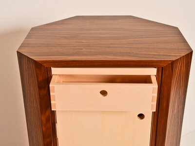 Der Drehschrank besteht aus einem Achteck mit integriertem Innenkorpus, welcher auf Metallbolzen und je zwei Kunststoffgleitblättchen gelagert ist. Der Außenkorpus ist in amerikanischer Nuss furniert und auf Gehrung verleimt. Der Boden ist eingefälzt und verschraubt, um gegebenenfalls zum verbauten Innenleben zu gelangen. Als Kontrastfarbe ist das Innenleben je nach Drehposition in Ahorn und amerikanischer Nuss belegt. Auf der glatten Rückseite des Innenkorpusses sind Ahorn-Kreissegmente als Schnaps-, Glas- und Zigarrenhalter versteckt.